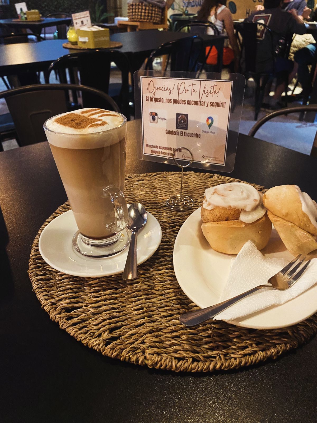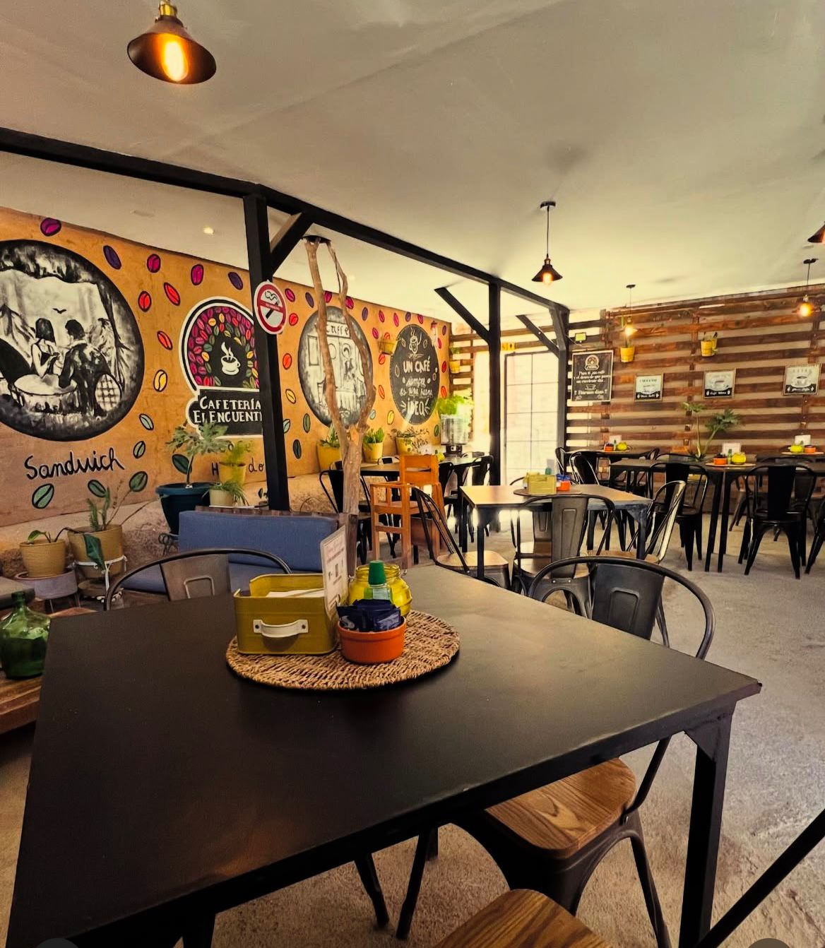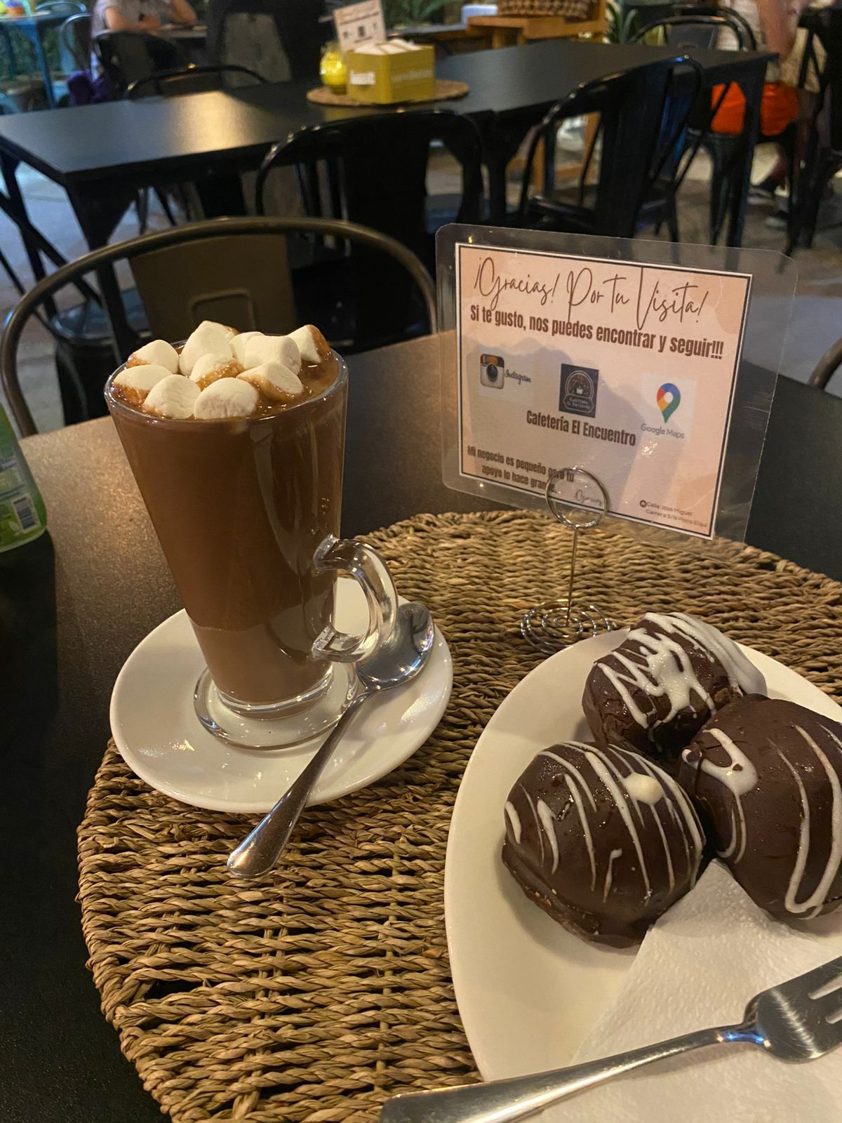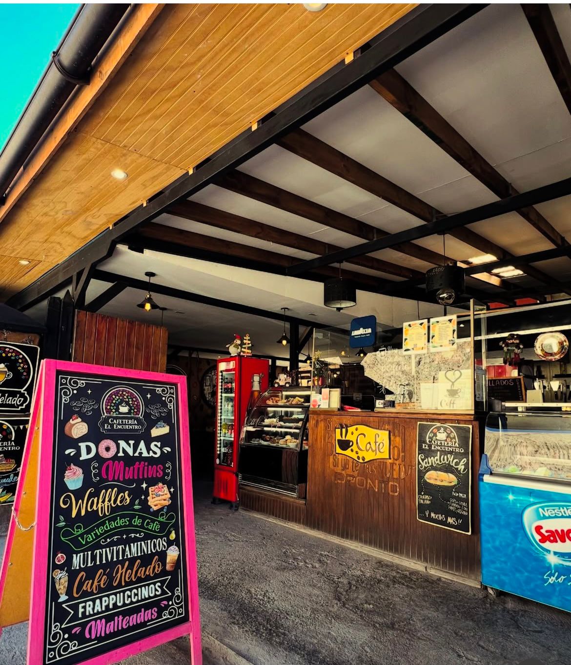 «Cafetería El Encuentro ofrece variedad en: pastelería, sándwiches, jugos, multivitaminicos, waffles, y por supuesto tú café favorito. A quién madruga un buen café le ayuda